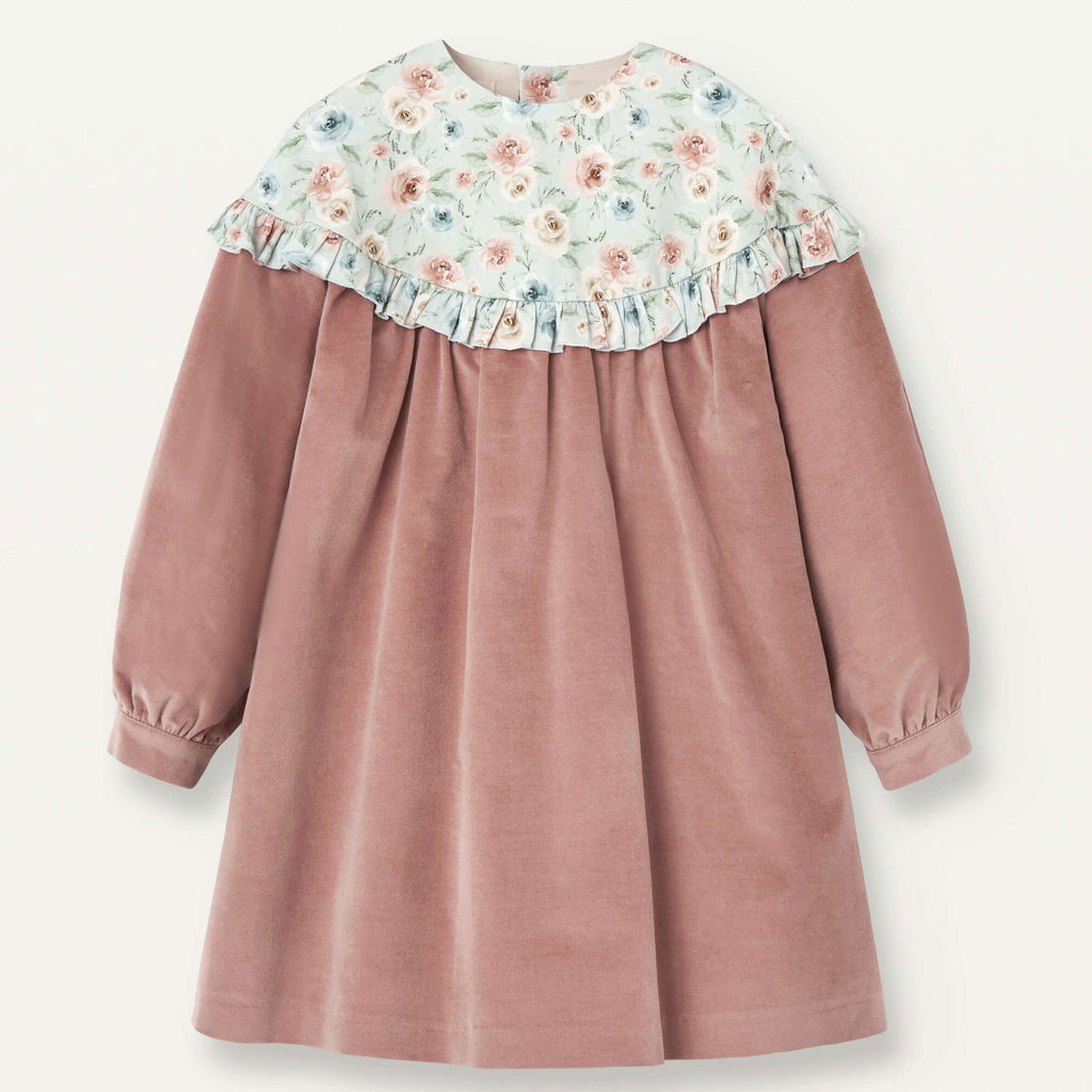 Popelin Pink Velvet Dress With Floral Yoke