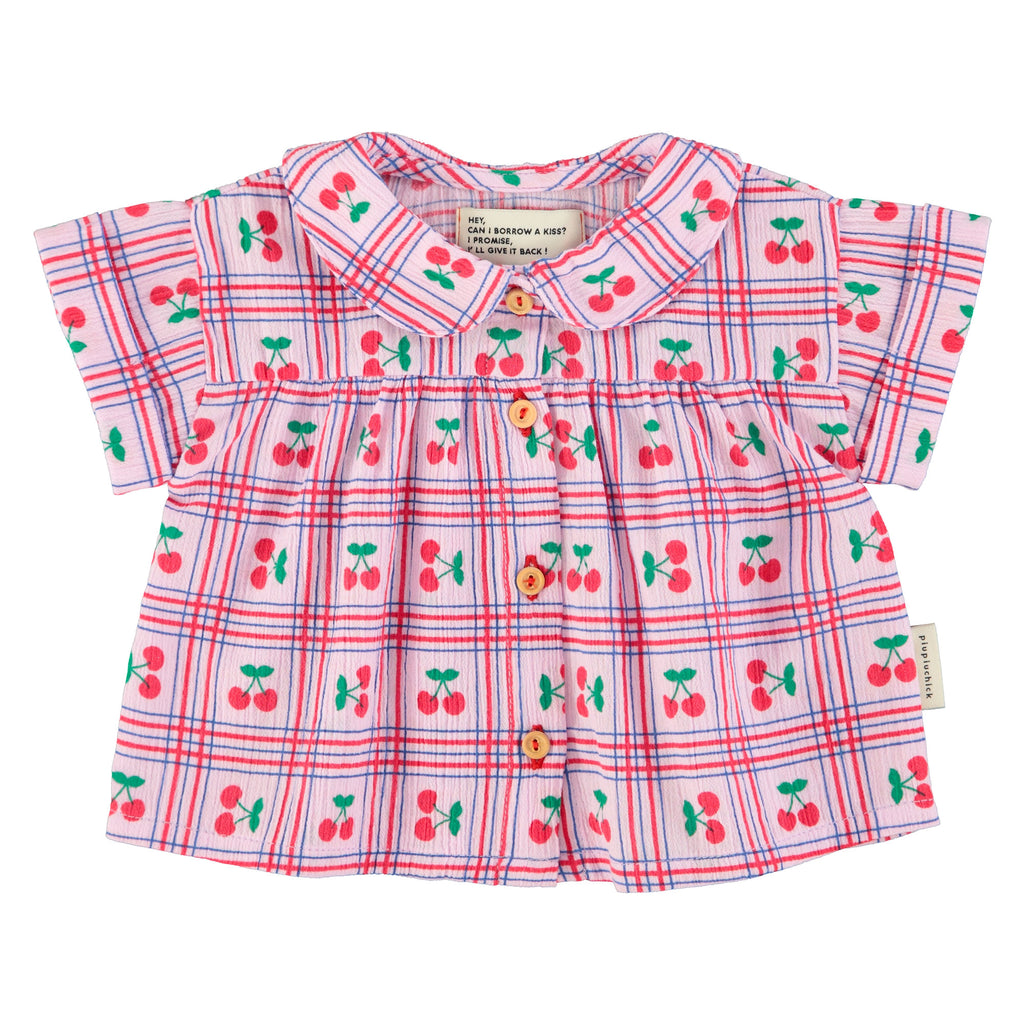 Peter Pan Collar Shirt With Short Sleeves. Wood Buttons On Front. Pleated Effect.