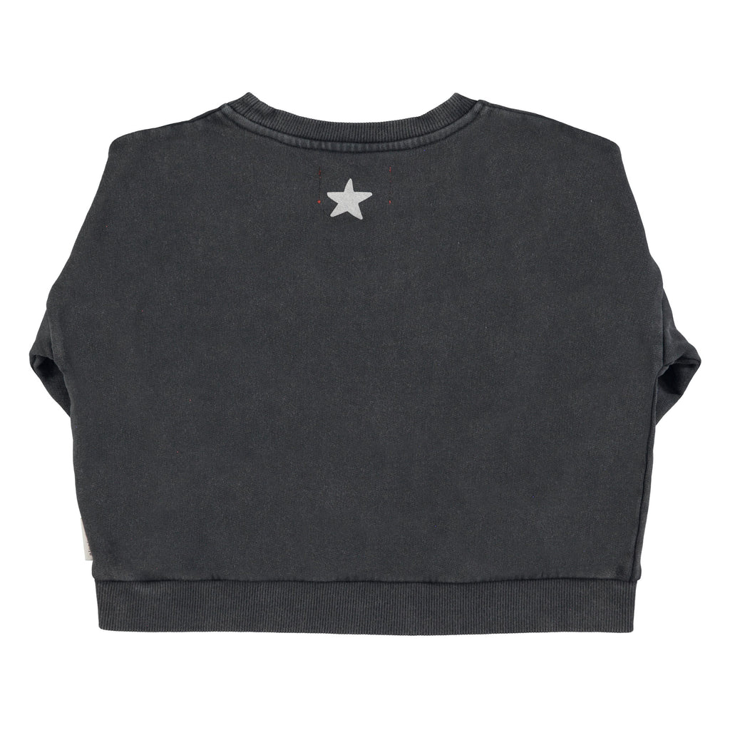 Unisex sweatshirt with frontal print and a little white star at back. Seam details. Carded organic cotton fleece. Ribbed cufs. Baby sizes have buttons on the shoulders.
